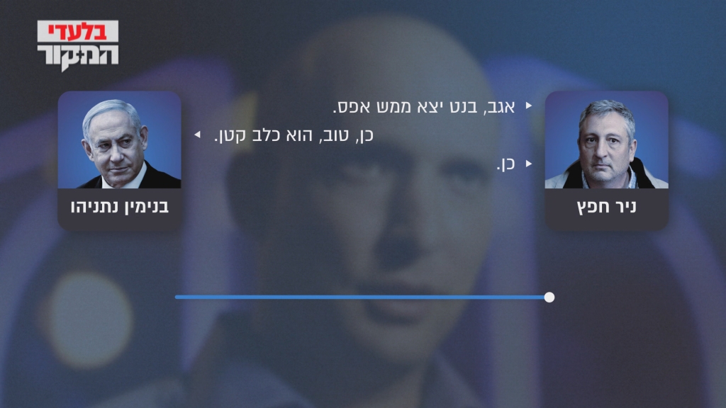 תוכנית המקור של חדשות 13 חשפה אמש ש הקלטת שיחה בין ראש הממשלה נתניהו לבין עד המדינה ניר חפץ מ-2018 ובהן נשמע חפץ אומר לרהמ אגב בנט יצא ממש אפס ונתניהו הגיב כן טוב הוא כלב קטן. המקור לא פרסמו את תגובת נתניהו מאחר שלדבריהם היא לא היתה עניינית. ניר חפץ יועץ לנתניהו במשך שנים.