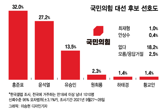 국민의힘 대선후보 선호도 홍준표 32 Vs 윤석열 27 머니투데이